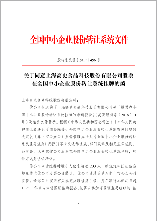 上海高更食品科技股份有限公司上市通知(公函)